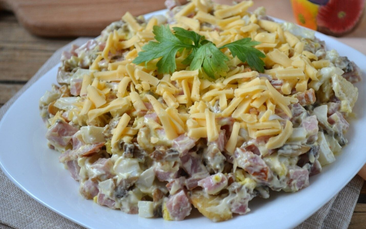 - При подаче салат рекомендуем посыпать сыром, натертым на крупной терке.
