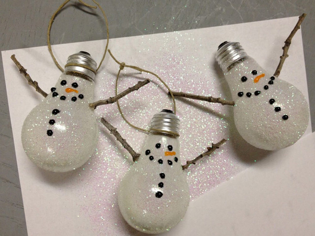 Веточку разделите на две части и с помощью суперклея присоедините их к лампочке так, чтобы они походили на руки снеговика. С помощью красок или маркеров нарисуйте снеговику глаза, рот, пуговицы и нос.
