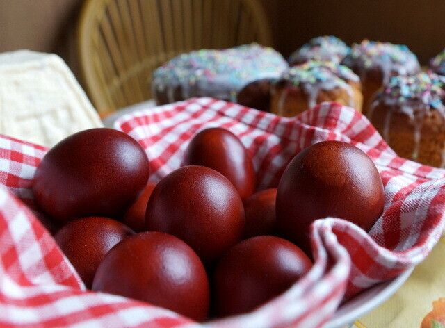 У традиции красить яйца на Пасху существует своя легенда, согласно которой во времена существования Римской империи люди могли посетить императора с прошением, только принеся ему что-либо в дар. Богачи несли в подарок правителю золото, а те, у кого золота не было, приносили то, что было в домашнем хозяйстве. И вот, когда Мария Магдалина решила принести императору Тиберию весть о воскресении Христа, оказалось, что у нее нет ничего кроме белого куриного яйца. Протянув свой подарок, она сказала: «Христос воскрес!» — но император рассмеялся и ответил, что поверит в эту новость, только если это белое яйцо сменит свой цвет на красный. И в тот же момент свершилось чудо — яйцо стало ярко-красным. Тогда удивленный донельзя император произнес: «Воистину воскрес!».Яйца стали главным символом празднования. Чтобы придать им красный цвет, их варили с луковой шелухой или корой деревьев. Более искусные хозяйки делали яйца-«писанки»: раскрашивали их разными узорами. Считалось, что яйцо перед освящением нужно очистить от скорлупы, чтобы святость лучше «прошла в него». Окрашенное в красный цвет пасхальное яйцо считается символом крестовых страданий Христа.