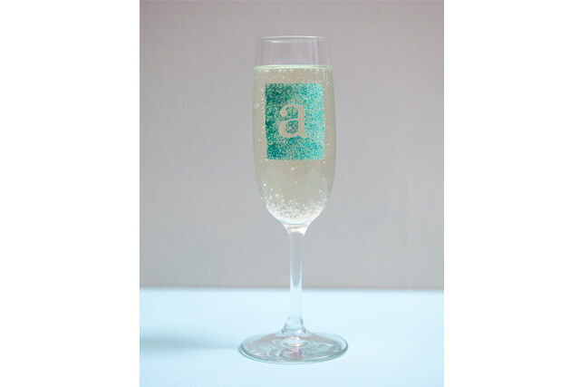 01 Клеящейся лентой мы обозначаем сегмент бокала, который хотим покрыть глиттером, очень важно наклеить ее ровно. Для пятна в центре мы выбираем какой-либо элемент, например, первую букву имени невесты или жениха, и клеим ее в середину ленточного квадрата.