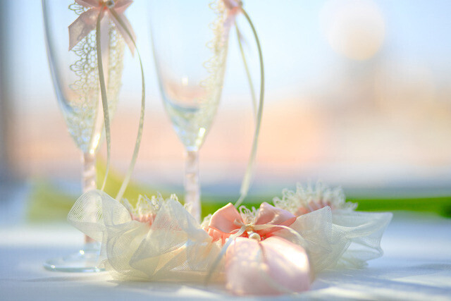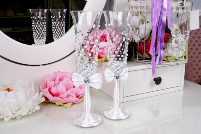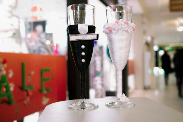 Рассмотрим все три варианта оформления свадебных бокалов — они базовые, в дальнейшем можно использовать вовсю свою фантазию и просто миксовать техники либо добавлять еще какие-то декоративные элементы в зависимости от ваших личных предпочтений и тематического оформления свадьбы.