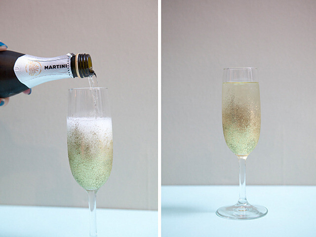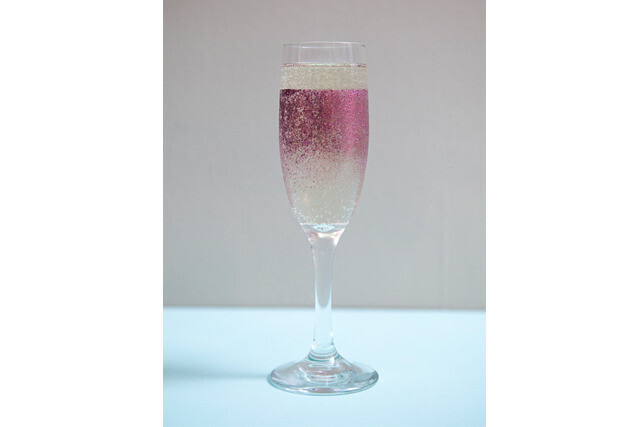 01 Наливаем жидкий глиттер в отдельную емкость для удобства нанесения. Берем спонж или губку, аккуратно начинаем наносить глиттер на бокал, создавая тем самым эффект смазывания: наибольшая плотность пигмента возле ножки бокала, дальше цветовое пятно как бы смазывается в направлении к кромке бокала, исчезая.