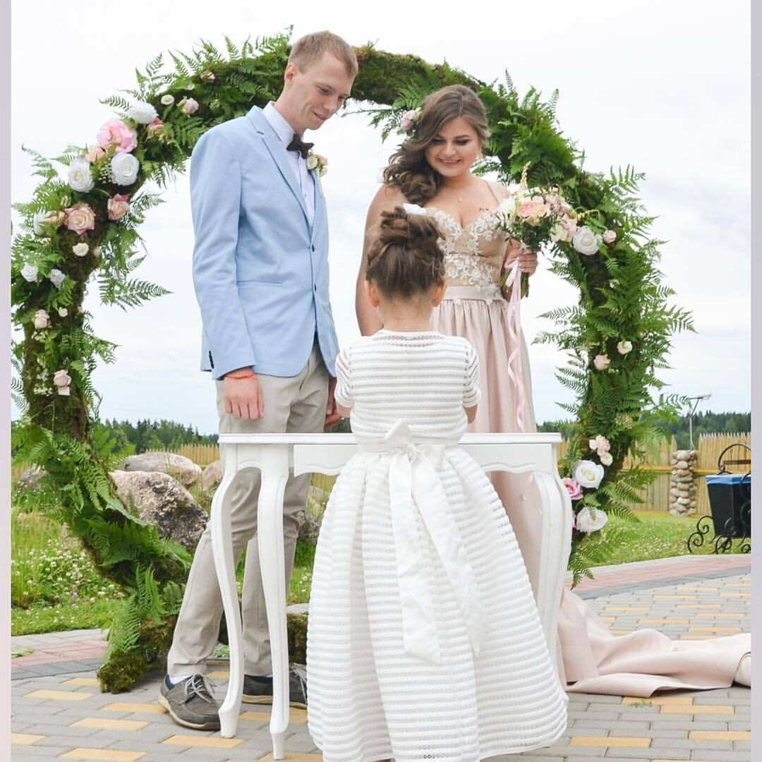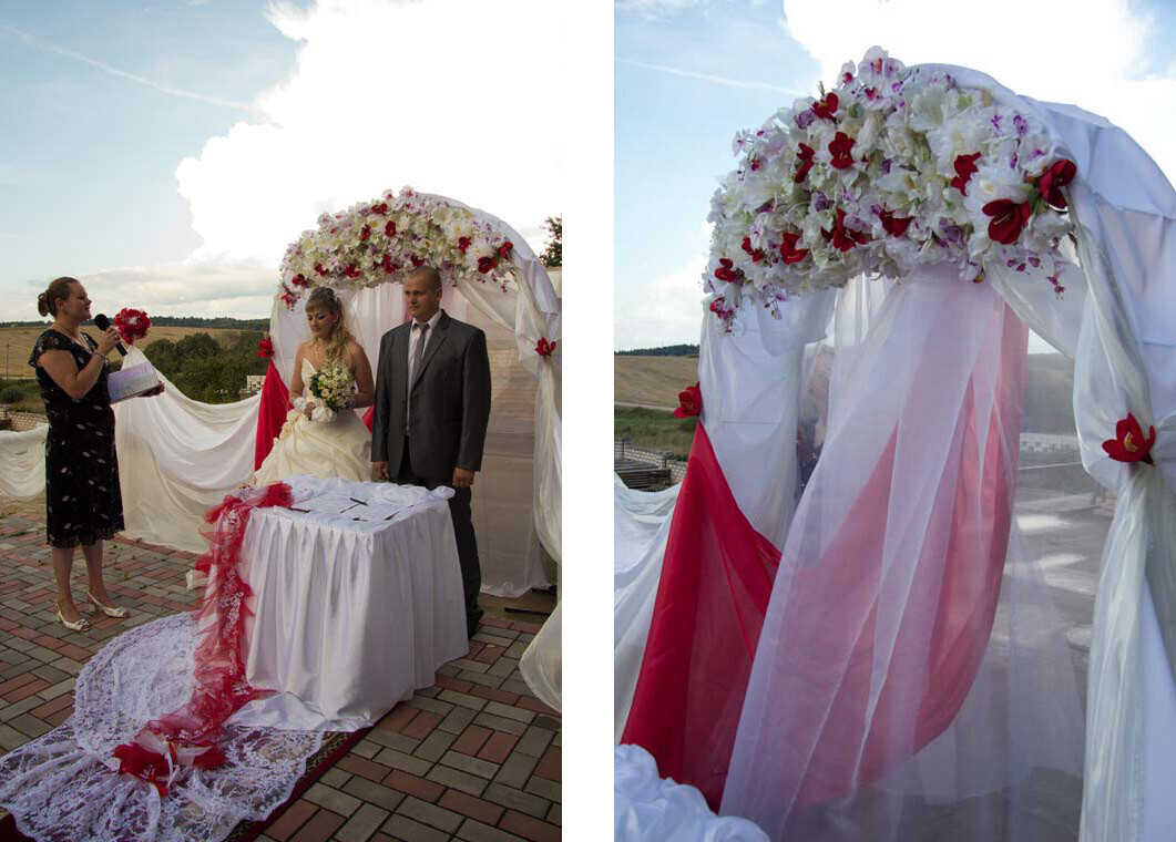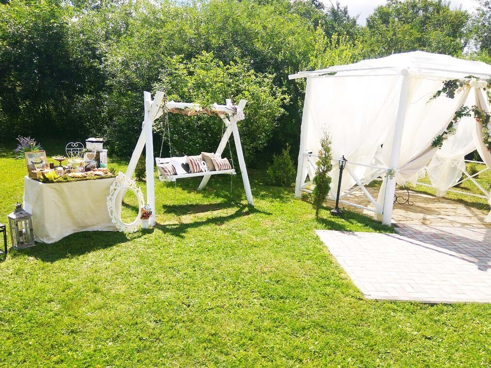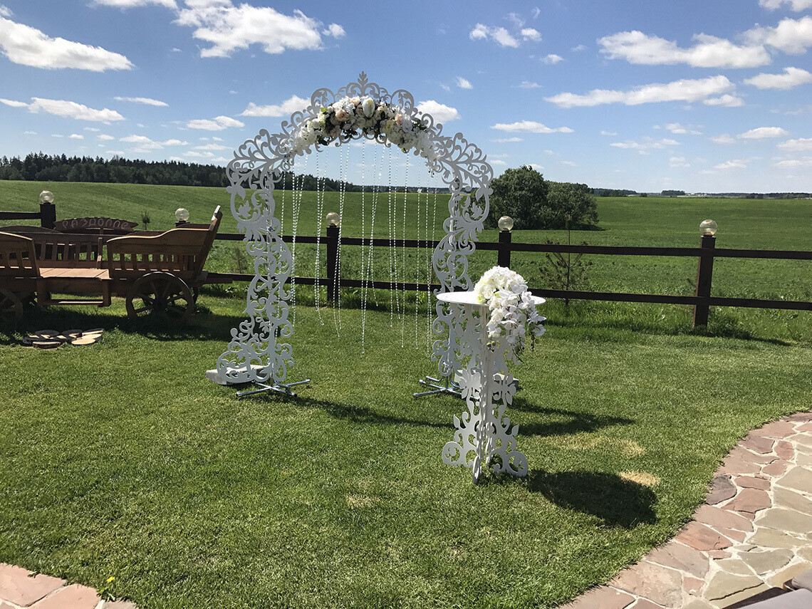 Декор для выездной регистрации: предоставляется столик для регистрации и металлическая арка (украшение — в отдельную стоимость). Локация для регистрации может быть выбрана по желанию молодоженов: возле пруда, на территории коттеджа, в поле, возле высотного тополя, возле остекленной веранды или внутри нее.