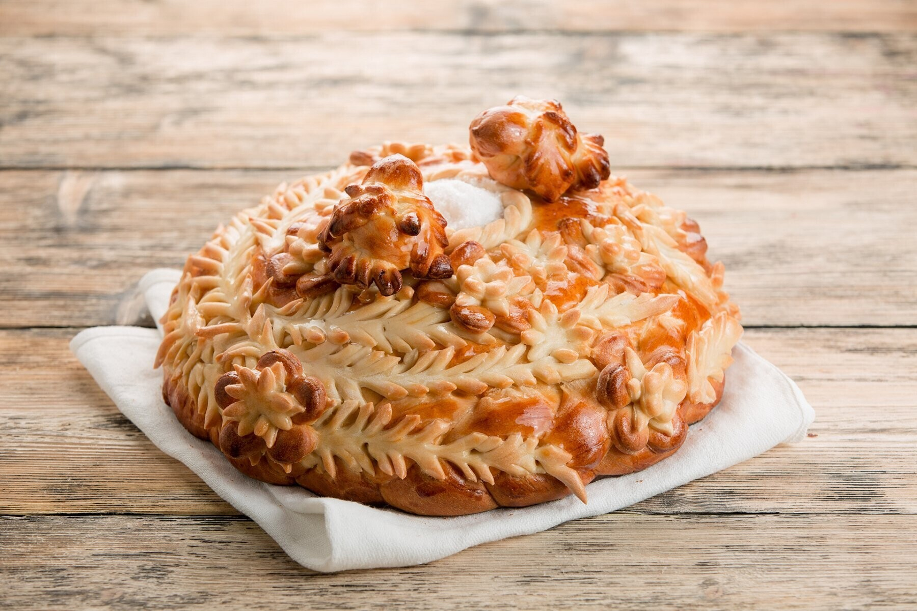Круглый румяный каравай, напоминающий солнышко, сулил молодоженам изобилие и радость в браке. Выносили мучной реквизит на пороге дома жениха на вышитом невестой ручнике. Гарниром к караваю предлагалась соль. По традиции молодые отламывали куски хлеба, опускали в соль и съедали. Такой ритуал символизировал переход в новую счастливую жизнь без соленых слез и горя.