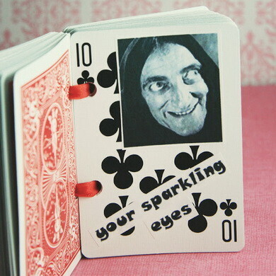 Вам нужна колода карт, желательно с красной рубашкой. Так подарок будет выглядеть «более любовным». Не замахивайтесь на самую большую колоду карт, если чувствуете, что с фантазией будут проблемы. С другой стороны, если вы сможете осилить самую большую, можно с гордостью похвастаться этим фактом перед любимым или любимой. Из журналов вырезайте нужные слова, картинки, подготовьте фотографии. Помимо этого вам понадобится клей, цветные ручки, маркеры, соединительные колечки (купите в магазине или оторвите от большой тетради). Если с колечками случиться дефицит, всегда можно перевязать колоду карт алой лентой, что будет смотреть еще более празднично.
