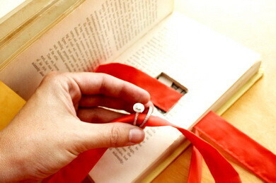 Вам нужна книга, резак (острый канцелярский нож), лента и подарок, например кольцо. Процесс изготовления потребует от вас ориентировочно 10 минут.