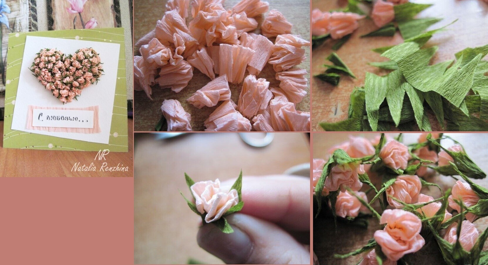 4. Теперь нужно соединить бутоны роз и листики, склеив их. Лучшего материала, чем гофрированная бумага, для творчества не найти. Она податливая, и из неё можно легко сделать бутоны натуральной формы.