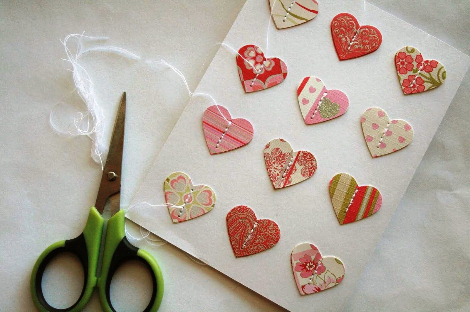 2. Сложите сердечки с пуговицами и пришейте их вместе к картону по диагонали — это будет лицевая сторона открытки. Начинайте пришивать с левого нижнего угла к правому верхнему.