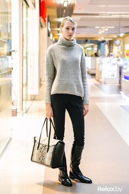 Объемный свитер с широким горлом носите с брюками-дудочками и высокими сапогами. Акцент можно сделать на сумке с модным принтом, имитирующим кожу рептилии.