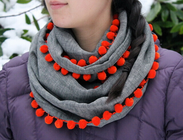 Также шарфы неизменно украшают помпонами. Эти маленькие шарики проще всего сделать самостоятельно. Достаточно сделать пять воздушных петель, которые смыкаются в кружок. После этого обвязывается середина (десять петель). Так делается пять рядов, после чего все петли стягиваются в три, а потом три — в одну. Готово!