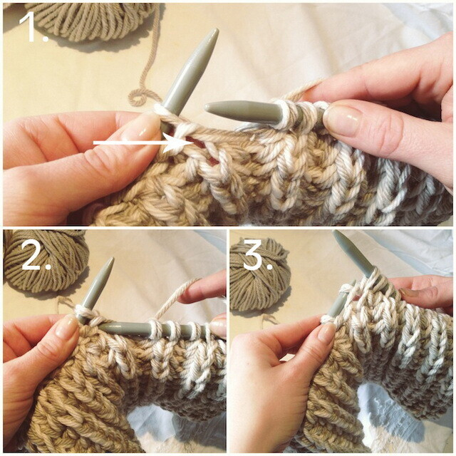 Далее идет ряд третий. Провязываем петлю и накид с прошлого ряда, затем производим накид, после чего петлю снимаем, не провязывая. Каждый будущий ряд снуда — это череда третьего и вторых рядов. Так вяжем до того момента, пока не достигнем нужной нам длины.