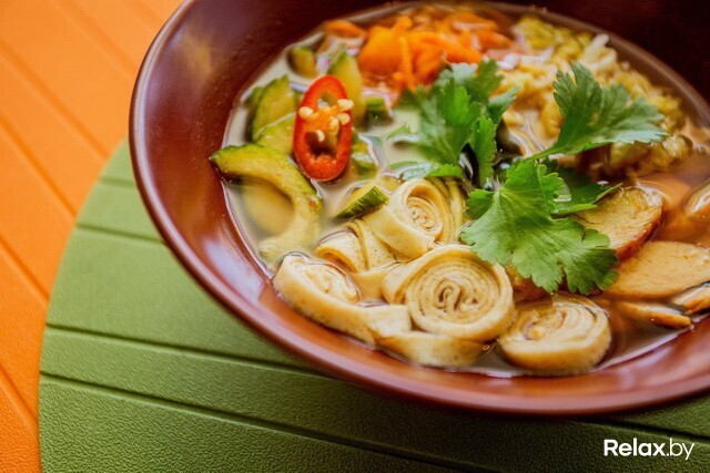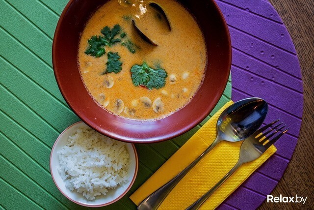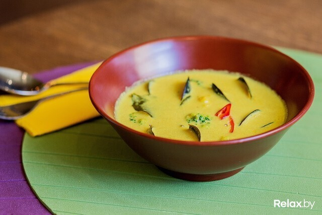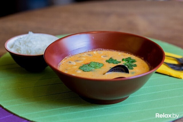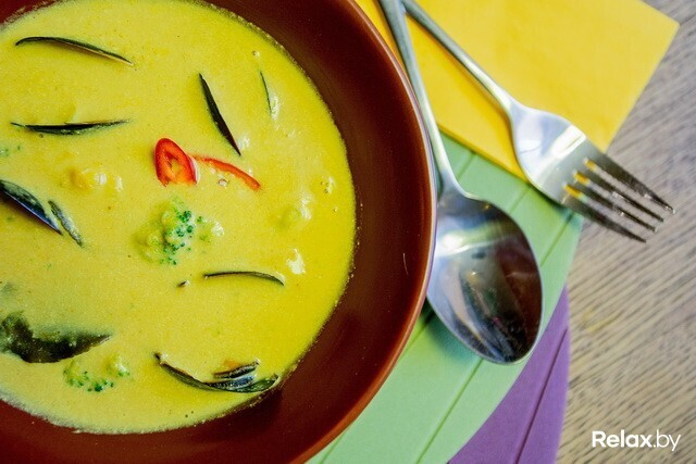Карри-суп радует глаз ярко-желтым цветом, который приобрел благодаря специям: куркуме и пасте карри. Суп наваристый, на рыбном бульоне со сливками, с филе белой рыбы, мидиями в ракушках, капустой брокколи и ростками бобов. Вкус мягкий, острота средняя, по ощущениям не такая, как в перечных супах, согревающая. Работники говорят, что это будет «бомба».