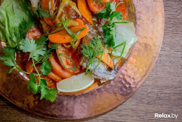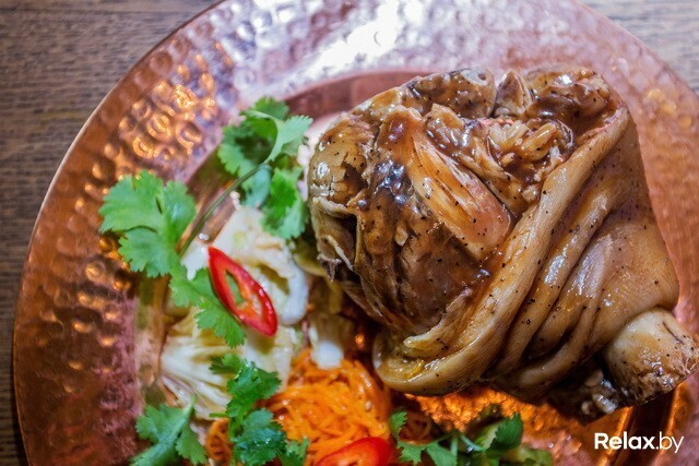 Из горячего мы попробовали рыбу и мясо. Радужную речную форель подают на большом медном блюде под специальным сладковатым соусом на основе томатов и чили и величают ее «Рыба по рецепту императрицы Хоу». Рыба очень вкусная, а главная ее особенность в том, что перед приготовлением из нее достают почти все кости! Но феерией стала 750-граммовая рулька по-суэльски, вываренная около 3,5 часов с анисом и корицей под перечным соусом. Подается она с капустой кимчи, корейской морковкой и битыми огурцами, выглядит очень аппетитно и по вкусу не уступает.