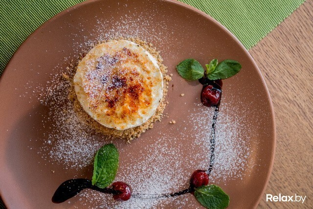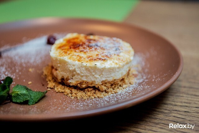И десерт. Чиз черри кейк — мягкий творожный с в меру сладким вишневым вареньем на подушке из крошки специального мультизлакового печенья. Перед подачей посыпается сахаром, который карамелизируют специальной горелкой.