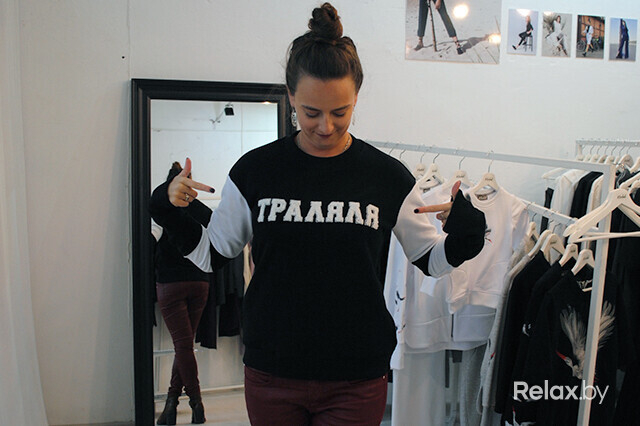 Поэтому, вооружившись подругой и ответственно записавшись на примерку, я приехала в «Корпус 8», на втором этаже которого и находится шоурум. У нас есть час, надо успеть перемерить все! Больше всего у Оли мне нравится трикотаж — свитшоты, юбки с нестандартным кроем, который уже стал отличительной чертой бренда. В новой коллекции есть черно-белые свитшоты с кирилличными надписями «Траляля» и «Труляля», есть красные с серым кроликом из Алисы в виде аппликации. И тот и другой сидят так, как будто я в них пришла, — очень в моем стиле. В красном понравились зауженные на резинку рукава, но куплю, скорее всего, черно-белый: «траляля» — слово, которое как нельзя кстати выражает мое ежедневное настроение.