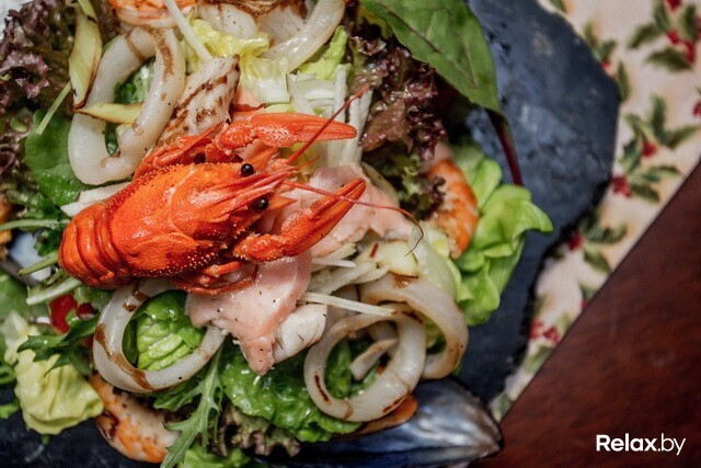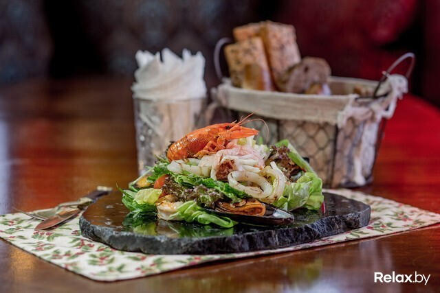 На салат «Дары моря» я смотрю с уважением. Креветки и кальмары на гриле, аргентинская мерлуза, маринованный лосось с яблоками и салатным миксом. Нужна определенная ловкость, чтобы с ним справиться, он тоже подается на камне. С грустью поглядываю на пирог, боюсь, что места для него уже не останется. Салат хочется доесть до конца, все очень правильно по консистенции и наполнению.