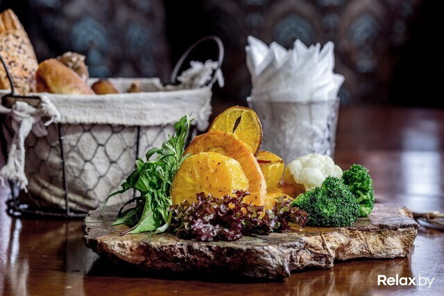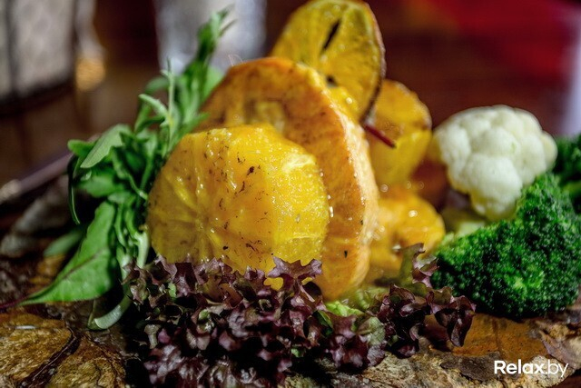 Приносят блюда. Горячее и салат — на массивных с неровным краем кусках мрамора. Издалека кажется, что это замысловатая витая винтажная статуэтка. На деле «Сальмон Оранж» — румяный лосось под апельсиновым соусом. Он слегка обжарен на гриле, но сохранил свою нежность, а вкупе с апельсинами дает совершенно новый для меня вкус — яркий и летний.