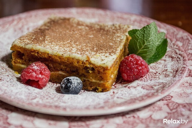 Кстати, в баре готовят имбирный эль с минимальным содержанием сахара, он отлично помогает справиться с трапезой, разогрев аппетит в качестве аперитива. Но вот уже и десерт — морковный пирог с творожным кремом, мягкий, правильной пропитки, не сухой, не сильно сладкий, без вызывающего морковного привкуса. В десертах я не сильна, но если бы заказывала, то что-то именно в таком духе.