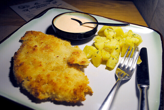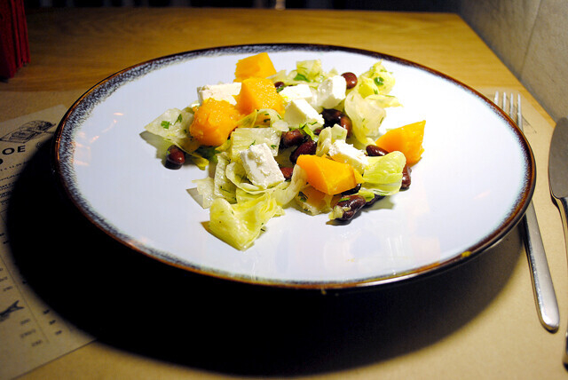 Мне, как человеку, который не особо любит рыбу и ест не все мясо, очень повезло. Салат с тыквой и красной фасолью, борщ с говядиной и куриный шницель с картошечкой. Очень просто, по-домашнему вкусно и быстро. Тыква вообще — писк сезона, мне она все больше и больше начинает нравиться, хоть раньше я очень скептически к ней относилась. Наваристый борщец со сметанкой, мягкий картофельный салат (вот единственное не поняла, почему салат. Как по мне, просто обжаренная картошка), увесистый шницель.