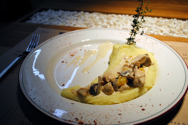 Из горячего — куриное фрикасе (да, мне никогда не надоест курица) с грибами, перцем и воздушным пюре.