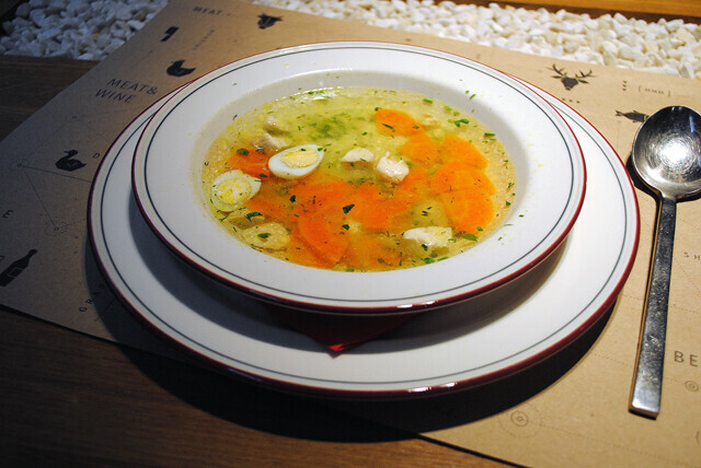 На первое выбираю куриный бульон — к сожалению, сильно недооцененное блюдо на модной гастрономической карте Минска. Хотя в предстоящие холода, как мне кажется, нет ничего лучше, чем согревающий бульончик с кусочками курицы, яйцом и овощами.