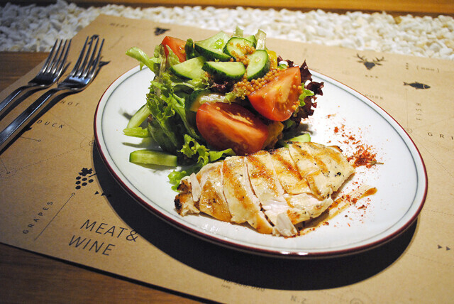 В качестве салата — обжаренный на гриле кусок куриной грудки с кустиком салата и апельсином в горчичной заправке. Вкусно и свежо.