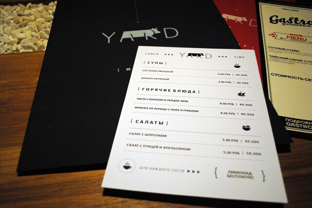 В Yard Café всегда чинно и спокойно: приглушенный свет, все учтивые и заботливые. Помню, когда впервые туда пришла, меня покорили настоящие полотенчики в уборных вместо сушилок для рук. Кстати, в обеденное время можно заказать и блюда из основного меню, например, стейк, но это уже совсем другая история, не правда ли?