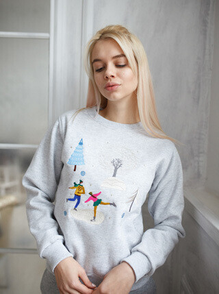 Свитшоты я перемерила почти все. Они очень тепленькие, с подкладкой. Цвета на любой вкус: синий, серый, белый, молочный, красный и розовый. Мотивы вышивки: катание на коньках, новогодние елочные игрушки, рождественский пудинг, пряничные человечки, леденцы. Я так долго искала источник новогоднего настроения, а надо было всего лишь померить пару таких свитшотов. Они немного наивные, даже детские, но это возвращает к настоящему празднику. Мне больше всего понравился серый, даже нет — снежный, с лисичкой, совой и снежинками, и белый с катающейся на коньках парочкой.