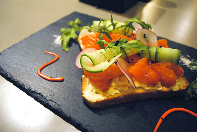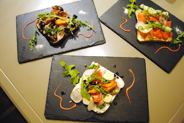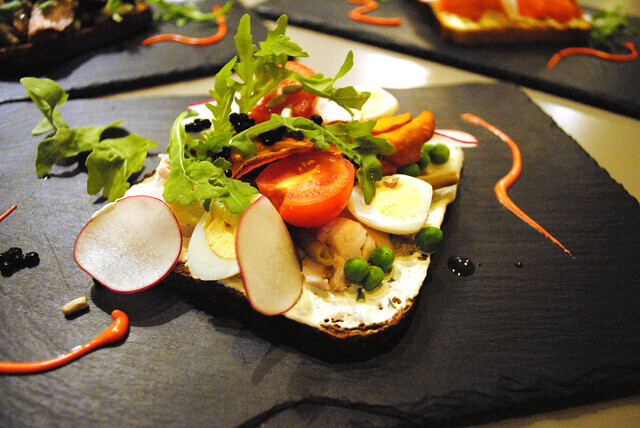 «Публика» вообще очень интересное заведение. Пожалуй, оно единственное в городе со скандинавскими мотивами в кухне. Сморребродов здесь 4 вида: с гравлаксом (слабосоленой семгой), яичным салатом, рукколой и редисом, с креветками, томленой семгой, рукколой и сырным соусом, с куриным филе, яйцом, зеленым горошком и маринованной стручковой фасолью (которую я приняла за черемшу), с ростбифом, картофельным салатом, бататом и рукколой.