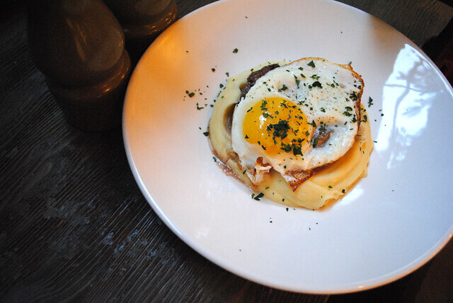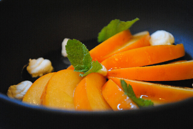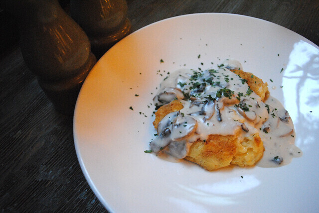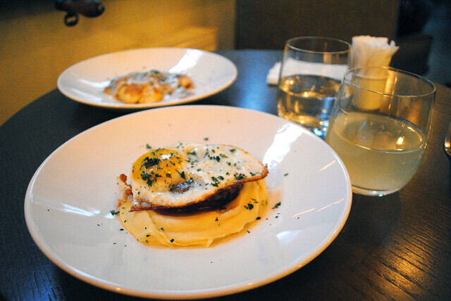 Я беру хурму с рикоттой, бифштекс с яйцом и картофельные котлетки с грибным соусом. Первая хурма в сезоне! Зима официально началась для меня — нужно как можно больше витаминов. Бифштекс, как оказалось, подают с картофельным пюре, но кого испугаешь двойной дозой картошки? Тем более, что котлетки просто волшебные.