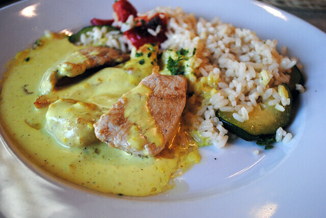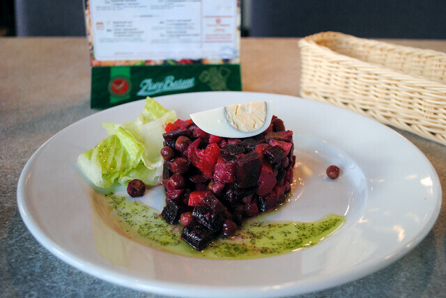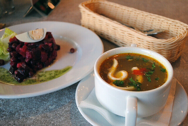 В понедельник в меню был фасолевый суп, винегрет и курица карри с овощами и рисом. Был еще салат с жареным беконом и сыром как альтернатива винегрету. В целом, это очень сытный обед. Если обедаете вдвоем, то вприкуску можно взять и пиццу. Вообще, меню очень разнообразное, а еще я заметила, что лучшие предложения всегда в пятницу, но это на мой вкус. Так что «Темпо» респект и уважуха (или так уже не говорят?).