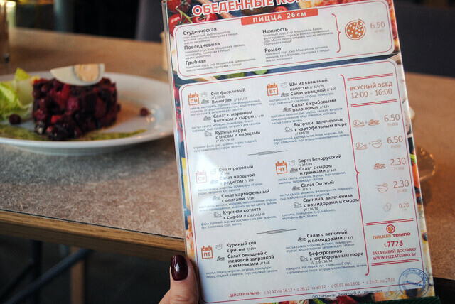 Обеденное меню расписано на неделю. Комбинировать блюда можно по желанию и фиксированной цене. Например, суп плюс горячее будет стоить 6,5 рублей, горячее плюс салат — тоже 6,5. Отдельно суп или салат — 2,3 рубля. Еще есть предложение по пицце: в обед «Студенческая», «Повседневная», «Грибная», «Нежность» или «Ромео» — по 6,5 рублей.