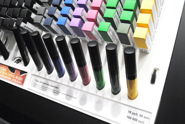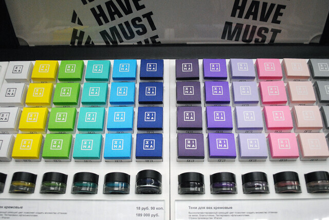 среди пустот и закрытых дверей открылся магазин цветастой косметики Mina. Как оказалось, первая точка этой марки работает уже с конца ноября в туманно-загадочном для меня ТЦ «МОМО» (где это?). Я об этой марке знать не знала, но пройти мимо такого буйства красок не смогла.