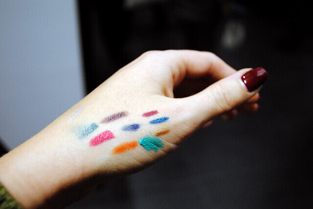 И это при том, что я как раз недавно обновила косметичку. Нужно было, конечно, дождаться мнения профессионалов. Знаю, что многие блогеры-стилисты уже накупили себе всех этих приятных на ощупь коробочек, чтобы опробовать и вынести вердикт. Но как можно пройти мимо желтой или розовый туши? Ладно, лаков целая палитра, но карандаши для глаз: серебряный, золотой, оранжево-золотой, синий, синий металлик, зеленый, красный (!). И все такое насыщенное, стойкое (руку отмывала полдня), сочное.