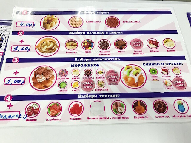 На фестивале все это выглядело очень аппетитно, но бьющая насыщенность розового на фуд-корте меня насторожила. Девушка-продавец-повар-кассир выглядела чересчур уставшей и советовать мне, как скомбинировать начинку, не решилась, сославшись на то, что вкусы у всех разные. «Что правда, то правда», — подумала я и собрала вафлю наугад. В пупырки ванильной вафли (бывают еще шоколадные) — начинку «Сникерс», в саму вафлю — киви со взбитыми сливками, сверху — топпинг «Лесной орех». Наверное, будет недостаточно сладко, подумала я, и заказала еще какао с зефирками. За вафлю вышло 6 рублей, какао с зефирками стоило 3 рубля.