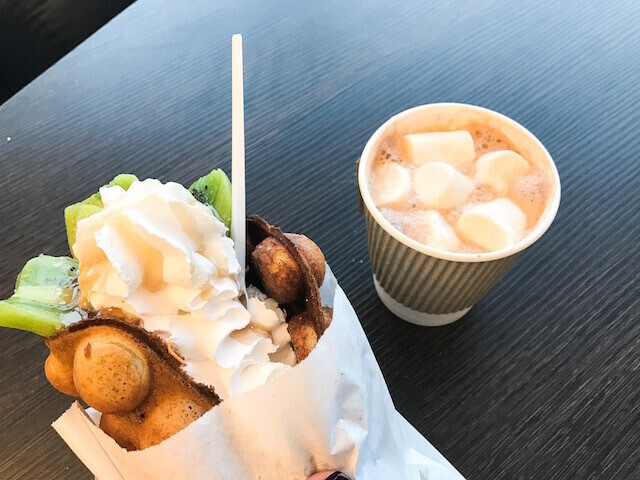 , где делают гонконгские вафли. Если вы еще не знаете, что это такое, и не пробовали их на последнем фестивале Vulitsa.Ezha, то рассказываю. Это такие пузырчатые вафли с разными начинками. Причем начинка есть и в скрученной в трубочку вафле, и в самих «пузырьках». Начинку выбираешь сам из предложенных вариантов: это может быть мороженое или фрукты со взбитыми сливками. В итоге получаешь очень фотогеничный и беспощадно сладкий десерт.