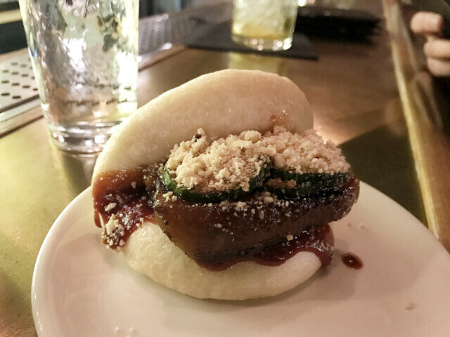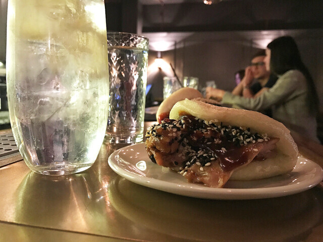 Во-первых, там и только там можно попробовать такую штучку, как гуа бао — тайваньскую закуску, которую некоторые гастрожурналы уже называют новым королем уличной еды. На вид это небольшая паровая булочка с разными начинками. В Martlet гуа бао делают с курицей терияки (бесспорный хит), грудинкой сумасшедшей толщины или грибами шиитаке. Признаться, такую булочку можно съесть вместе с пальцами, особенно такому любителю всего хлебного, как я. Начинка в этой закуске очень крутая, вроде как ничего особенного, но Вадим Астори явно обладает каким-то тайным знанием.