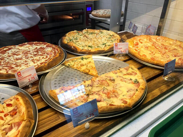 Под большим лого, который, скорее всего, символизирует восход солнца, написано «С 1999 года», а над витриной большими буквами и три раза — «Живи вкусно». Это вселяло надежду. Кроме ожидаемой пиццы, можно выбрать что-то из горячего, салат и суп. Ассортимент пицц достаточно большой: «Маргарита», «Венеция», «Ташир», «Пеперони», «Кантри», «Европа» и другие. Все составы написаны на ценниках, которые выставлены в витринах, так что разобраться несложно. Из горячего — макароны по-флотски (на вид именно они), лазанья, гречка с овощами и грибами, картофель по-римски. Из салатов — «Цезарь», «Столичный», «Неаполитанский» и из свежих овощей. Мой обед состоял из пиццы «Венеция», салата «Неаполитанский», вареной кукурузы (с лета ее не ела) и морса и обошелся в 8 рублей 52 копейки.