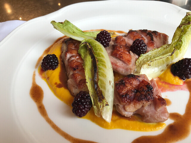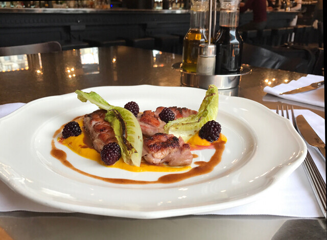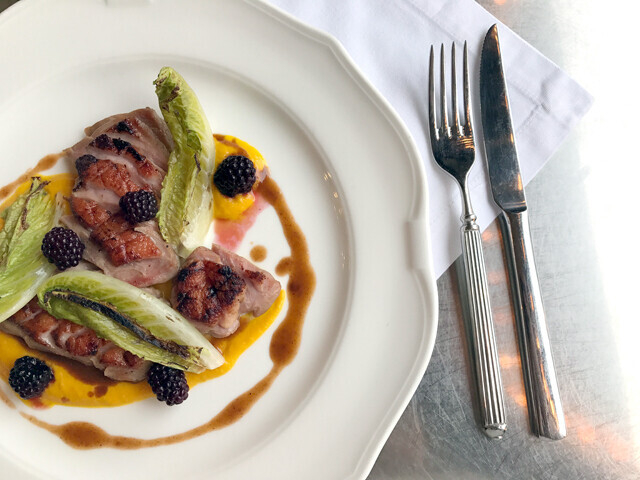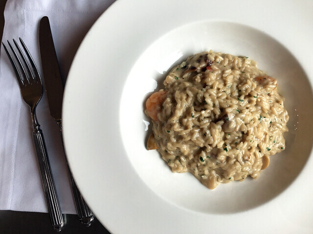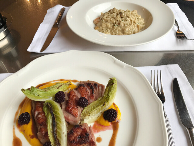 Мне очень настойчиво рекомендовали попробовать рыбу: сибаса, судака, осетра с красной икрой — но мне хотелось мясного и фотогеничного, поэтому выбор был сделан в пользу утиной грудки. На морепродукты, однако, тоже соблазнилась: взяла на пробу ризотто «Море и горы». Утиную грудку подали на пюре из тыквы и имбиря (и с лемонграссом, которого я не почувствовала). Мясо нежное с поджаристой корочкой, но больше всего меня впечатлила ежевика. Ее «маринуют» в красном вине с бадьяном, черным перцем и корицей. Ризотто с креветками и белыми грибами было очень вкусным, но никакого места для десерта не оставило.