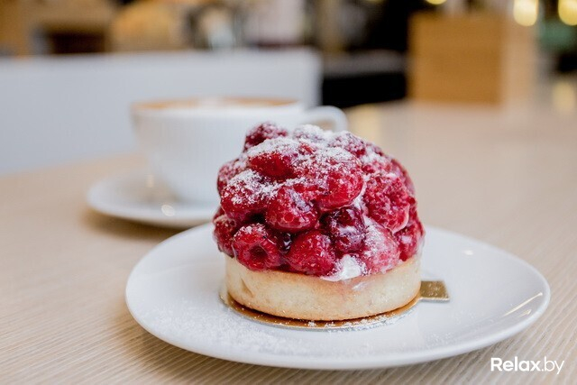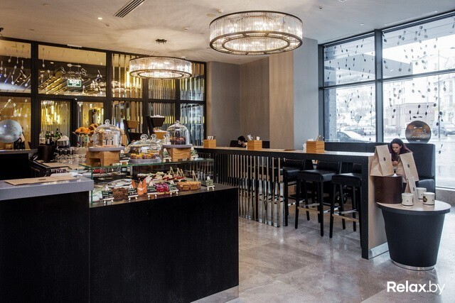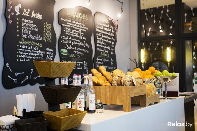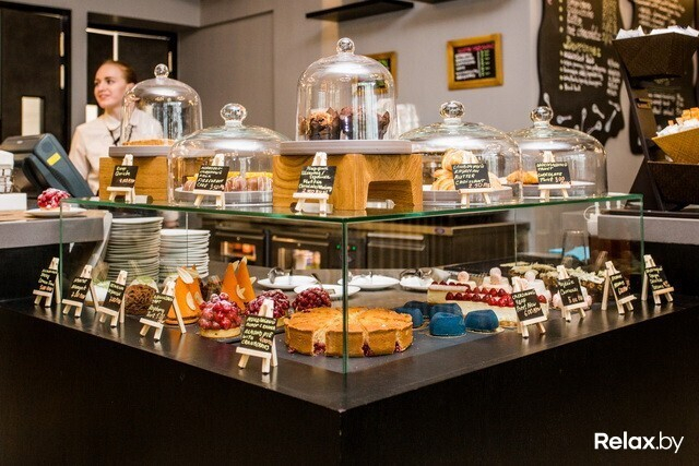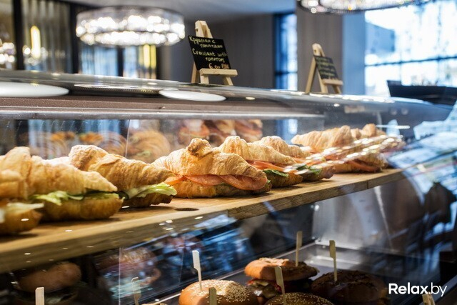 . Выглядит оно очень по-европейски, как мы любим: в витрине у кассы готовые пирожные, образцы круассанов и бейглов. Около 10 утра приносят свежеиспеченный хлеб. Кроме этого, можно заказать салат или суп.