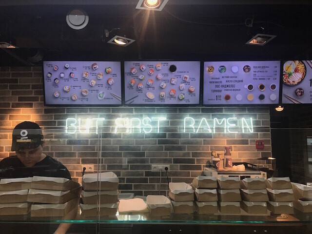 Спот выглядит очень симпатично, на больших экранах видно меню, просматривается за стеклянной дверью и кухня. Готовят быстро, порции такие же внушительные, как и при доставке. Я всегда заказываю в Tokiny рамэн с курицей или говядиной. Порцией в 570 граммов можно с легкостью утолить голод, подлечить желудок или похмельный синдром. Или все это одновременно. Недаром на стене светится слоган — But first ramen (что значит — «но сначала рамэн»).