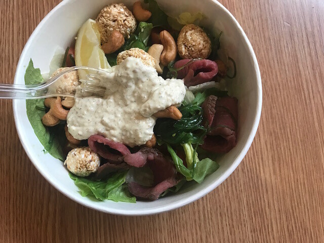 Tokiny делает отличные суши (их можно заказать на выбор 5, 8 или 12 штук), лапшу и рис. Но на сей раз я решила попробовать один из салатов — с ростбифом и кешью. Он подается с интересным густым ореховым соусом, на выходе тоже довольно большой — 190 граммов. Кроме кешью и ростбифа, который раз на раз не приходится (то мягкий кусочек, то трудно жующийся), в салате есть водоросли чука (хорошо перемешайте, они на самом дне), шарики из сливочного сыра в кунжуте, томаты черри и салатный микс.