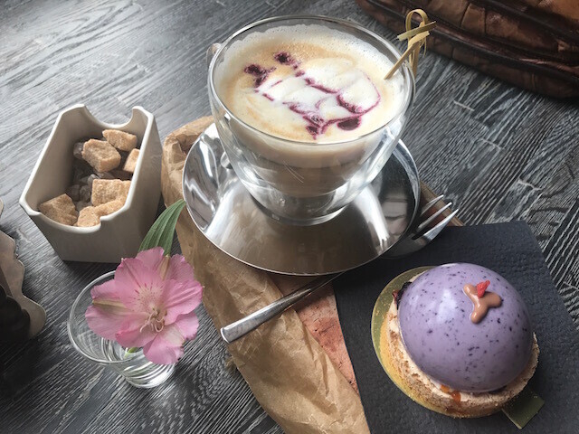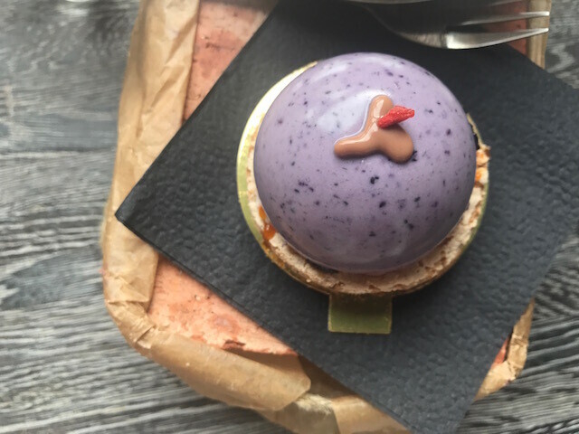 посетителей прямо у входа встречает создатель сета. Он с радостью рассказывает и про кондитерскую, и про сам сет, заботливо указывает на свободные столики. Кофе и десерт приносят на огромном рыжем кирпиче, завернутом в бумагу. Выглядит эффектно, но официанткам искренне сочувствуешь. Тем не менее, десерт — пирожное Billberry — очень вкусное. Все нотки из описания десерта я не почувствовала, но муссовая шапочка из черники на хрустящей ореховой подушке очень понравилась. Философия сета, как и всей патиссерии, — в фитнес-штучках. Например, в десерте использованы ягоды годжи и черника — они ускоряют обмен веществ. Кофе сделан с добавлением вытяжки из зеленого кофе и натуральной черники. Худеть можно очень вкусно, оказывается.