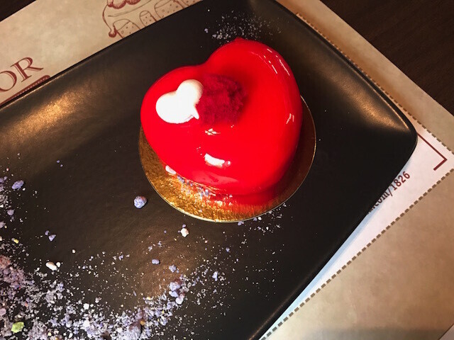 , который на Ленина, 3, я обычно захожу мельком, взять какое-нибудь пирожное навынос и съесть его по дороге. В дни гастрофеста здесь, как и везде впрочем, аншлаг. Алые сердечки разлетаются по залу вмиг. Десерт из маскарпоне с нежным бисквитом и грушевой начинкой под глянцево-красной глазурью. В меру сладко, не очень жирно. В пару к нему делают классический кофе с молоком. Кстати,