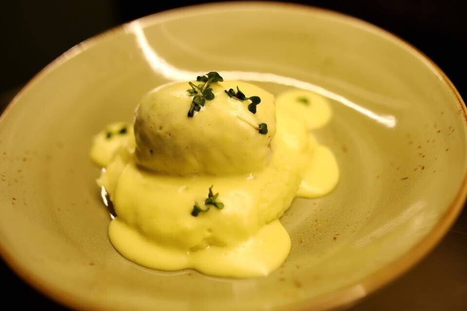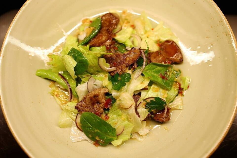Ланч-меню состоит из трех салатов, двух супов и трех горячих. Все блюда можно заказывать по отдельности, а можно воспользоваться ланч-формулой — так выйдет еще дешевле. Например, суп с вешенками и судак с пюре и соусом «Голандес» обойдется в 11 рублей, а салат с говядиной и куриное филе с яйцом пашот — в 12 рублей. Набор из супа, салата и горячего — в 15 рублей.