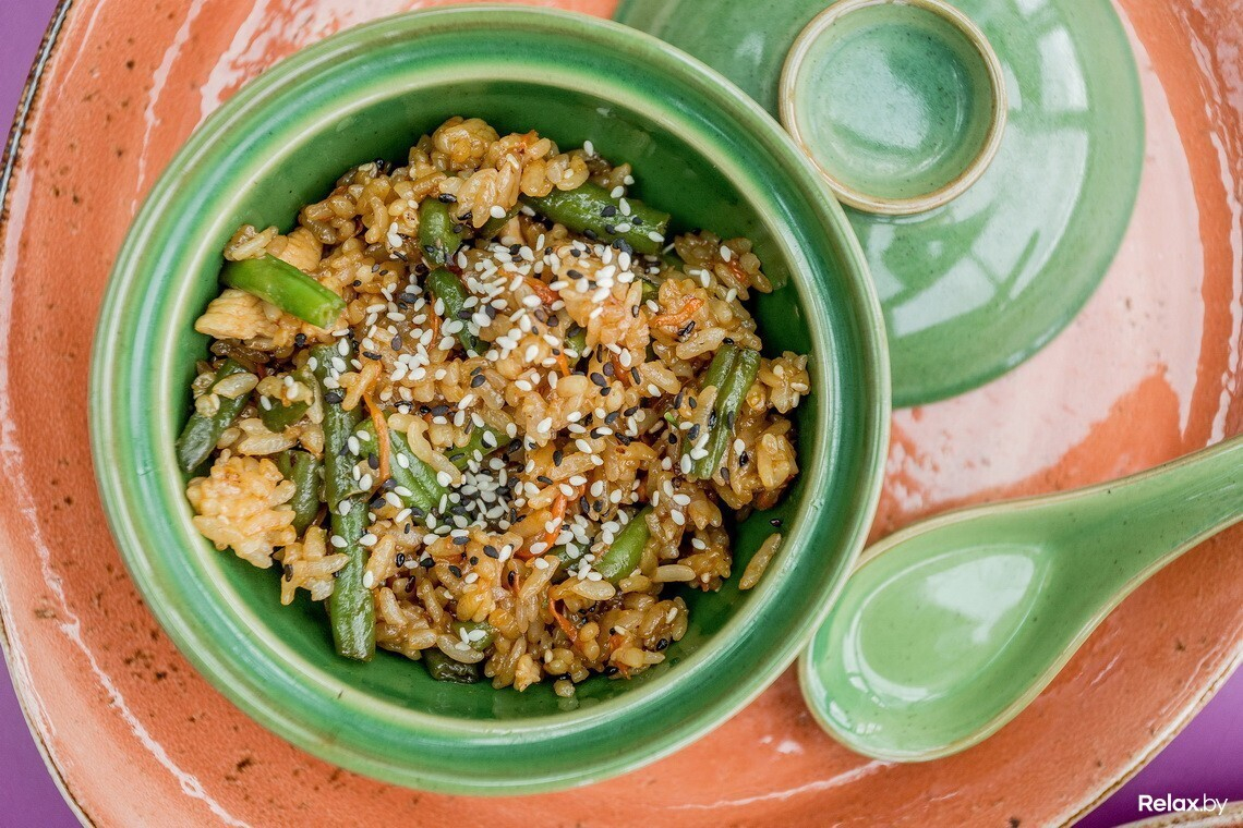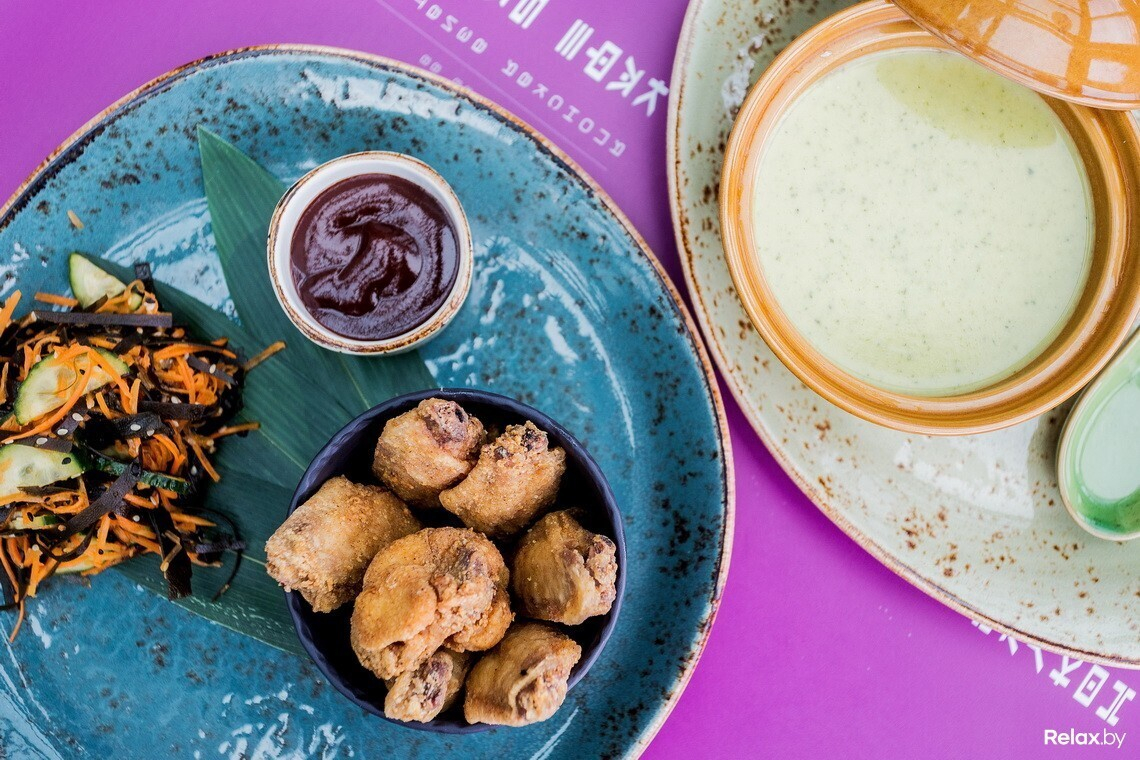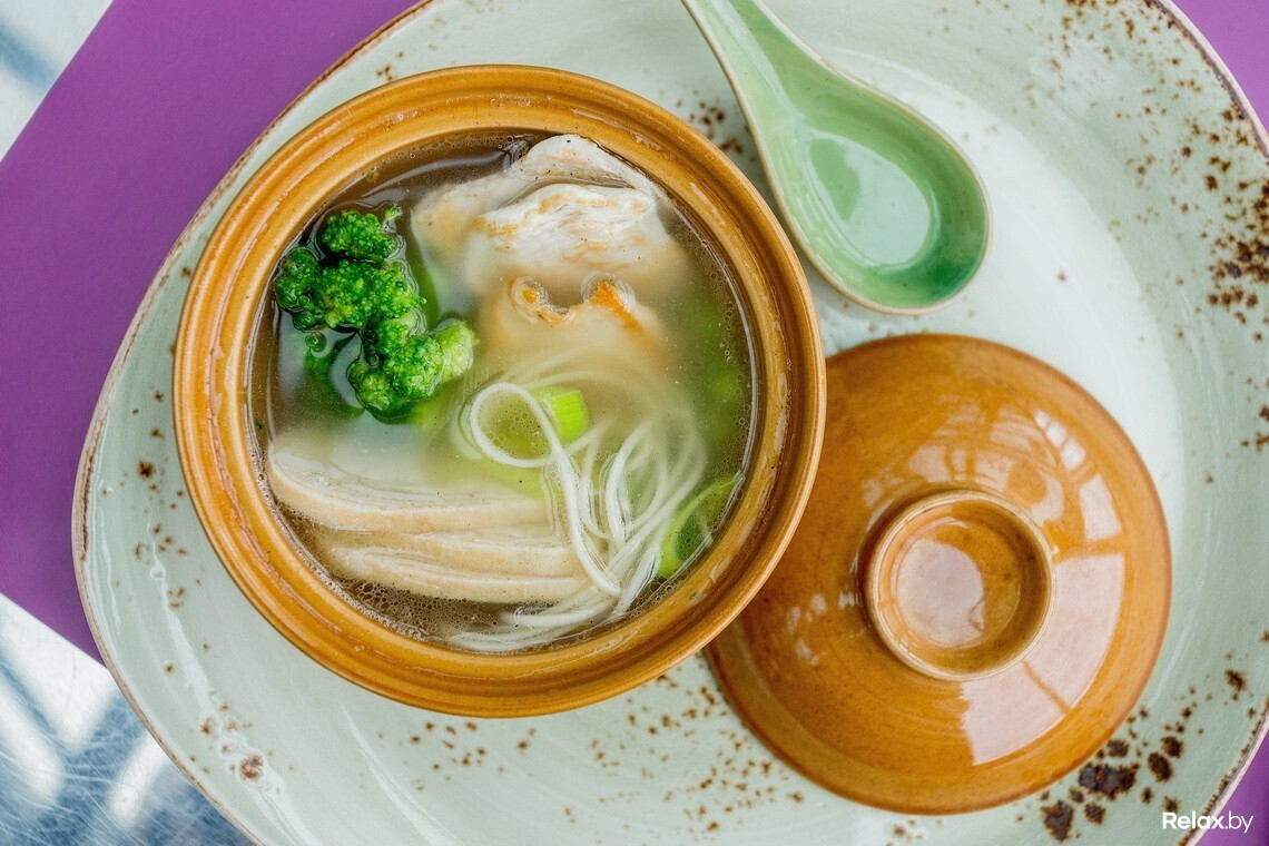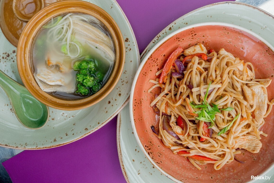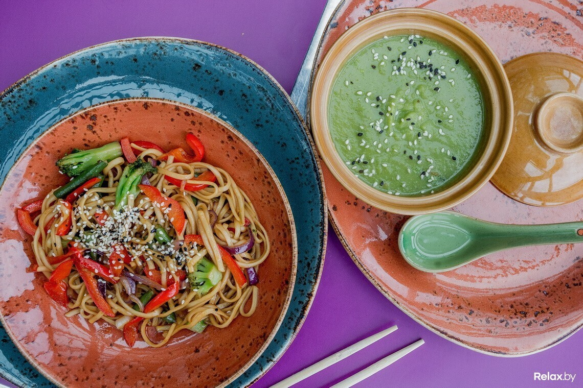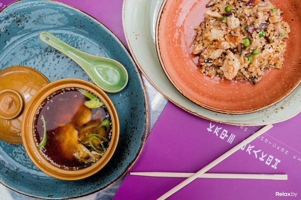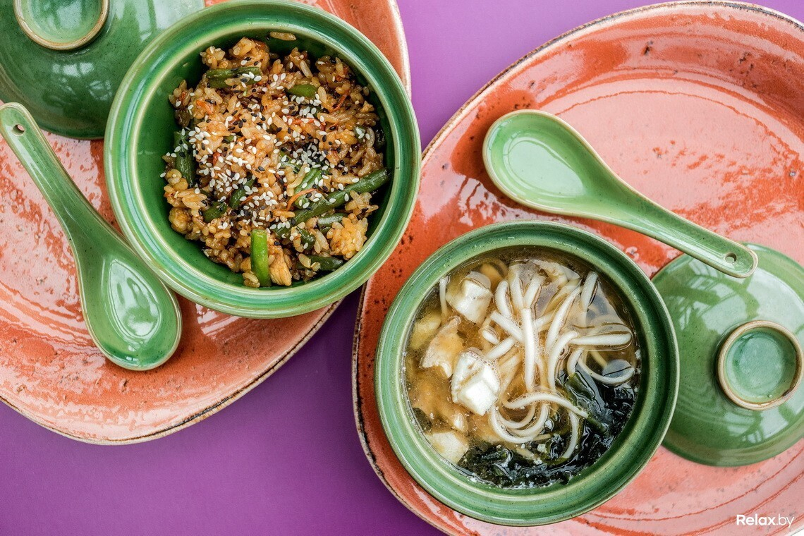 Ланч-меню, которое действует с понедельника по пятницу с 12:00 до 16:00, разработано на каждый день отдельным сетом из двух блюд: супа и горячего. В понедельник — это суп с водорослями даши комбу и тяхан (рис) с курицей и овощами, во вторник — крем-суп из цукини и пряные крылья с соусом барбекю, в среду — крем-суп из брокколи и лапша удон с овощами, в четверг — рамен и лапша с курицей, а в пятницу — рыбный суп «Суимоно» и рис с куриным филе в соусе терияки. Любой ланч обойдется в 7,5 рубля.