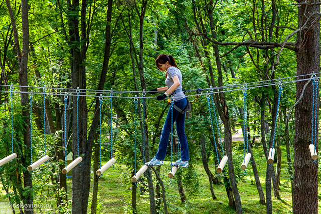 В парке есть висячие мосты, подвесные бревна, веревочные переправы, спуск по веревке на специальном ролике и другое.