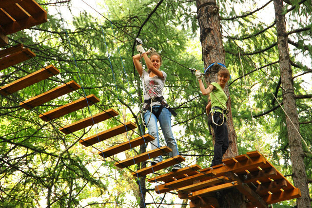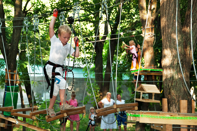 В веревочном парке имеется два уровня: на высоте 1,5 метра (для детей и подростков) и на высоте 4,5 метра для серьезных искателей экстрима. Аттракцион прекрасно подходит для тренингов по тимбилдингу, так как вполне можно устраивать командные соревнования.