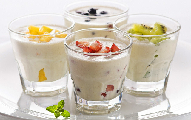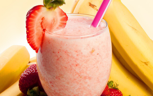 Сначала нужно измельчить ягоды и банан, потом добавить молочные продукты и все еще раз перемешать до однородной массы.
