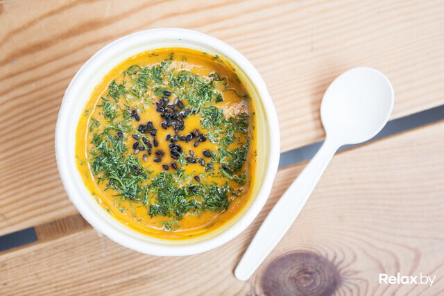 Вегетарианец: «Суп-пюре — мой любимый вариант супа. Этот оказался достаточно густым, в меру сладеньким и чуть-чуть острым — то, что нужно для обеда. Ну и яркий оранжевый цвет супа красиво сочетается с мелко рубленной зеленью».
